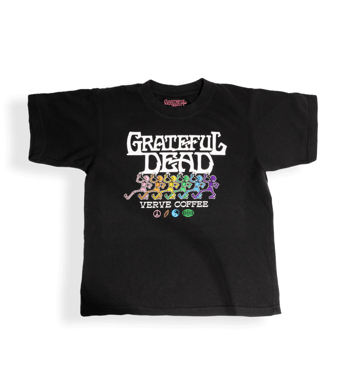 Ride the good energy wave. A washed-black tee featuring dancing skeletons and the Verve x Grateful Dead logo. Made for slow mornings. loud music and brighter days ahead.